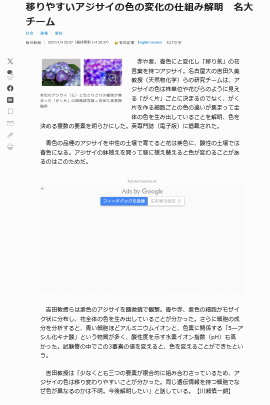 アジサイの色 2021年の記事 毎日新聞 アジサイ一般 2025.09.30 https://mainichi.jp/articles/20210104/k00/00m/040/274000c オリジナル論文はこちらでダウンロードできます。https://www.researchgate.net/publication/347096317_Single-cell_analysis_clarifies_mosaic_color_development_in_purple_hydrangea_sepal